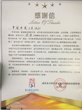 风雨同心,共抗疫情:beat365平台官方网站收到青山区新冠肺炎疫情防控指挥部感谢信