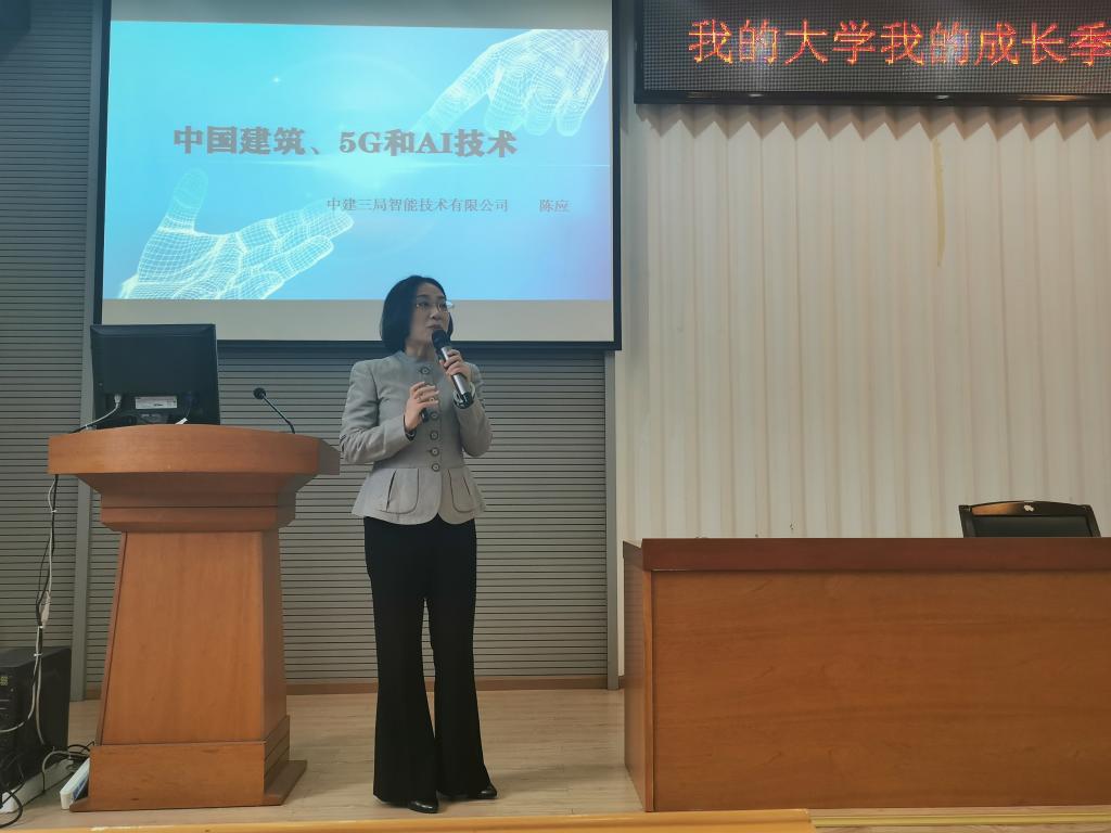 陈应以《中国建筑、5G和AI技术》为题,向同学们介绍了中国建筑在智能建造、智慧城市等领域的新技术、新发展,并着重向同学们讲解了5G的关键技术和应用案例、5G在智能建筑中的运用、人工智能技术及人工智能技术在智能建筑中的运用。同时,她以武汉长江新城为例,介绍了智慧城市建设中的核心技术。最后,她结合自己二十多年的工作经历,与同学们分享了八点青年领导者需要具备的素养:一是对国家、企业、朋友忠诚;二是具有高度的责任心;三是博览群书;四是具备超凡的学习力;五是具有良好的沟通交流能力;六是脚踏实地的工作;七是常怀感恩之心;八是永葆激情。