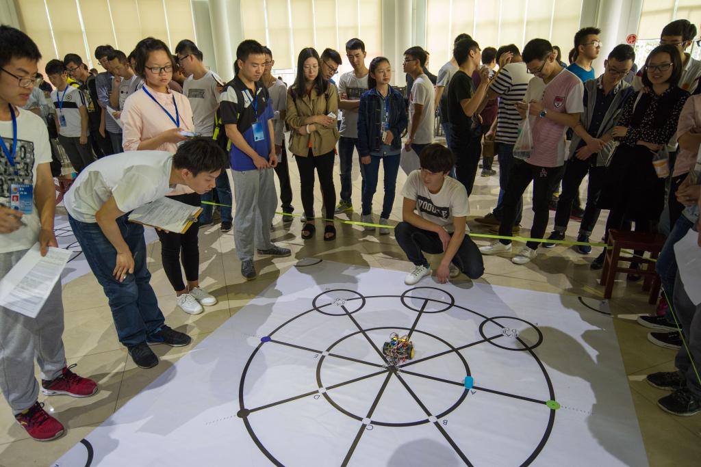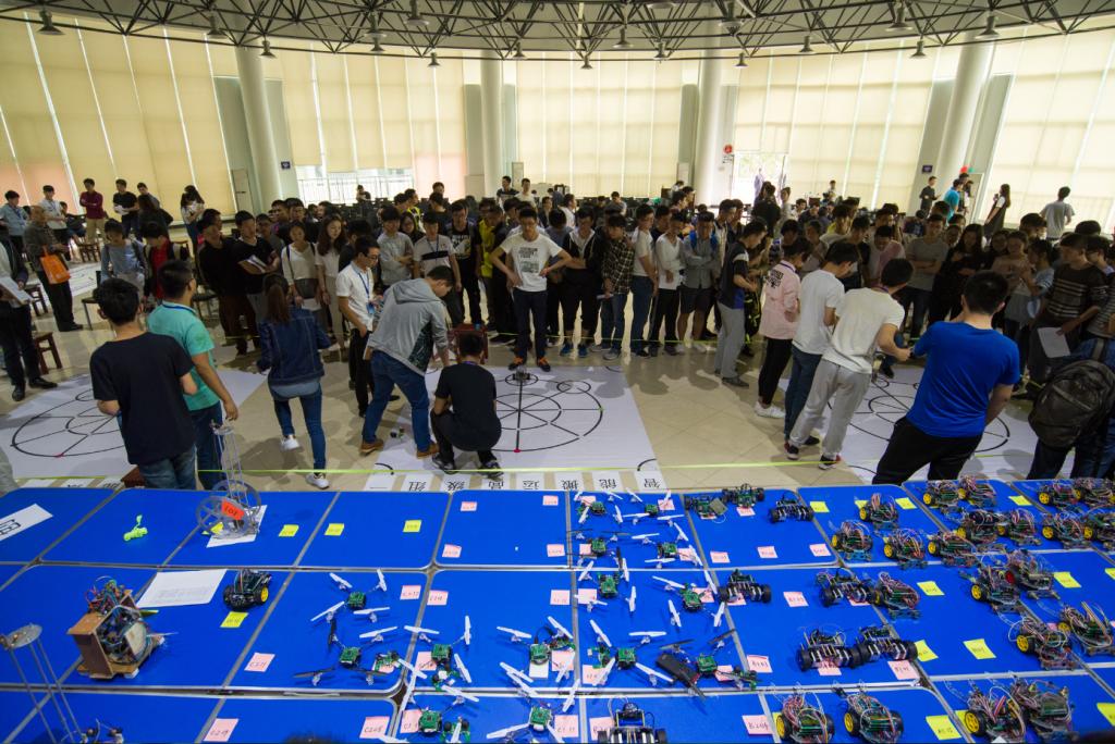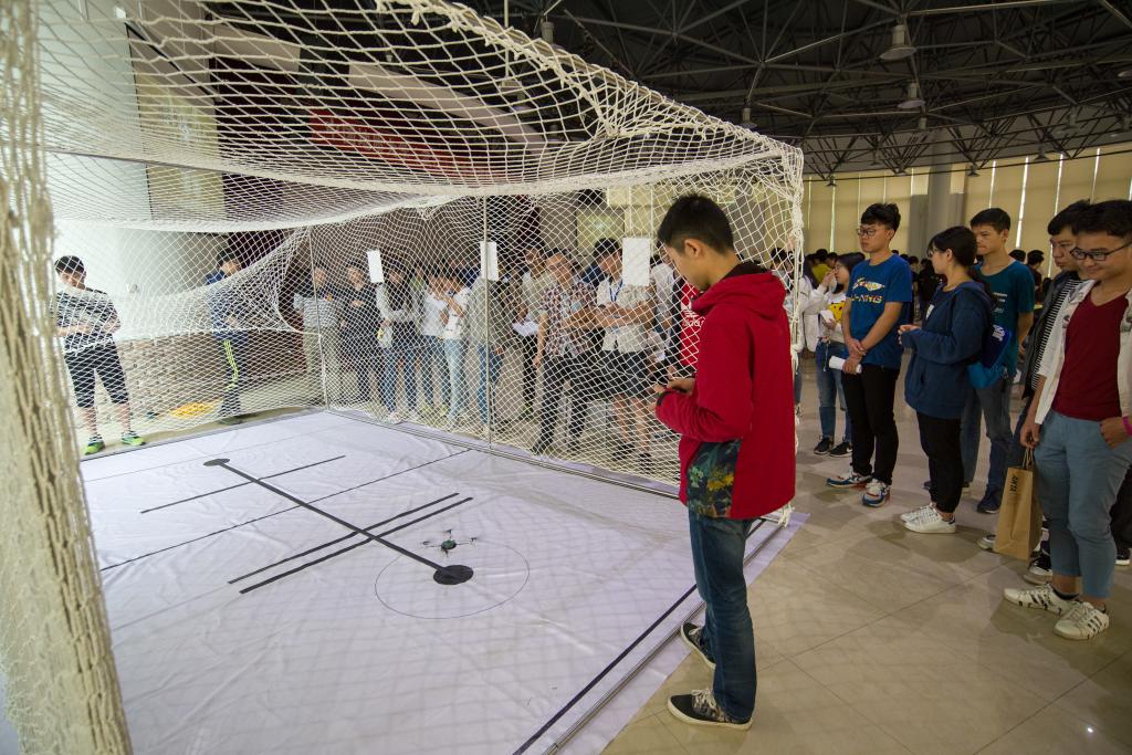 各组别比赛同时进行。智能搬运组小车要求将小物体搬运到指定位置;两轮自动平衡车组要求快而稳的按照既定路线进行比拼;四旋翼组要求无人机按照轨道飞行并降落在指定区域;创意组不限制形式,要求选手展示作品的功能及创意。其中,创意组展现的直接利用砝码的重力势能转化成机械能带动小车运动,受到了评委老师的一致肯定与表扬。创意组指导老师殷蔚明表示,这样的驱动方式是极具创意性的,且其他团队也完全是学生自主创意,指导老师只参与主题的探讨,学生的独立能力得到提高。同时他表示,这些模型未来发展的应用面也很广泛,如军事、警用、民用等方面,虽然目前还只是一个雏形,但基本功能已经具备。