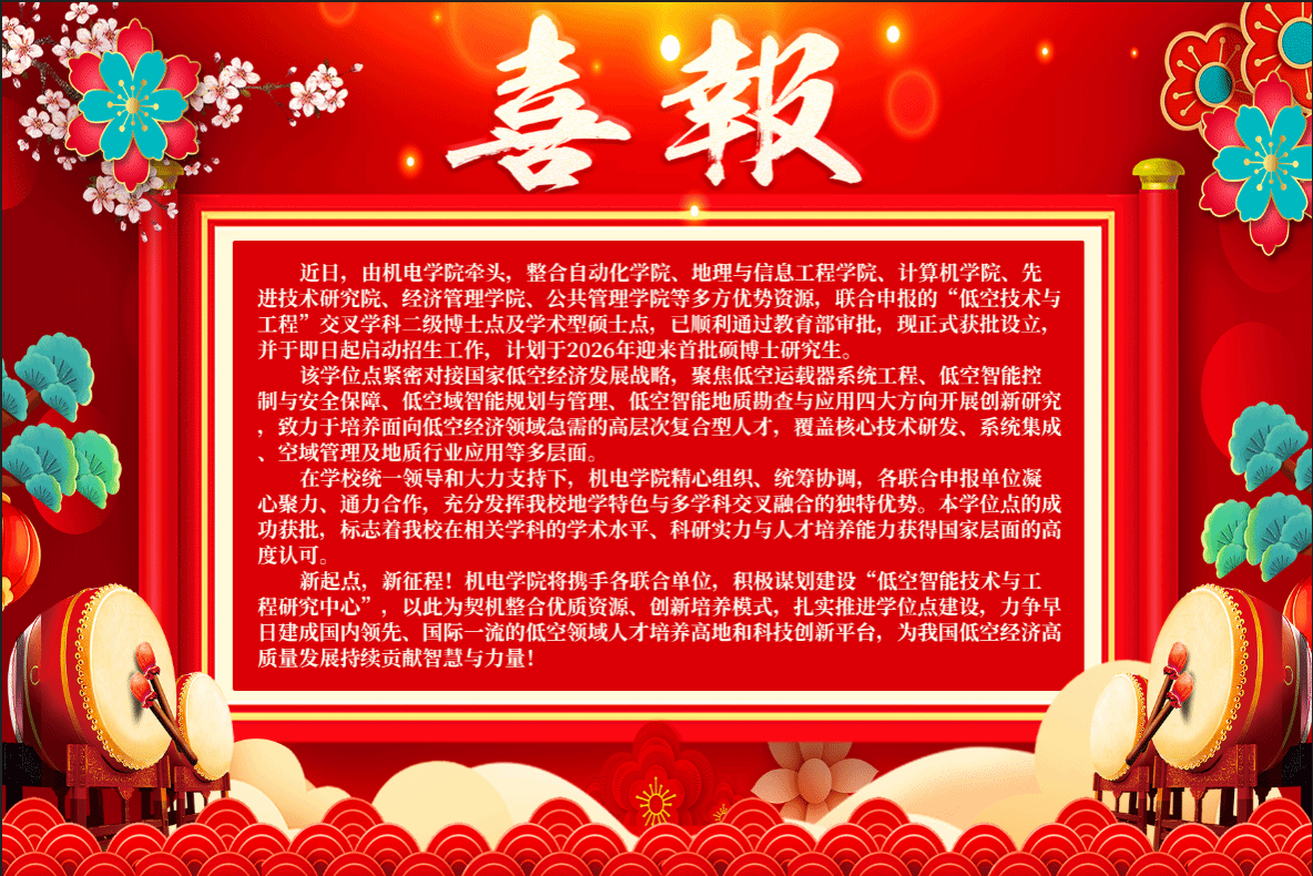 近日,由beat365平台官方网站牵头,整合自动化学院、地理与信息工程学院、计算机学院、先进技术研究院、经济管理学院、公共管理学院等多方优势资源,联合申报的“低空技术与工程”交叉学科二级博士点及学术型硕士点,已顺利通过教育部审批,现正式获批设立,并于即日起启动招生工作,计划于2026年迎来首批硕博士研究生。