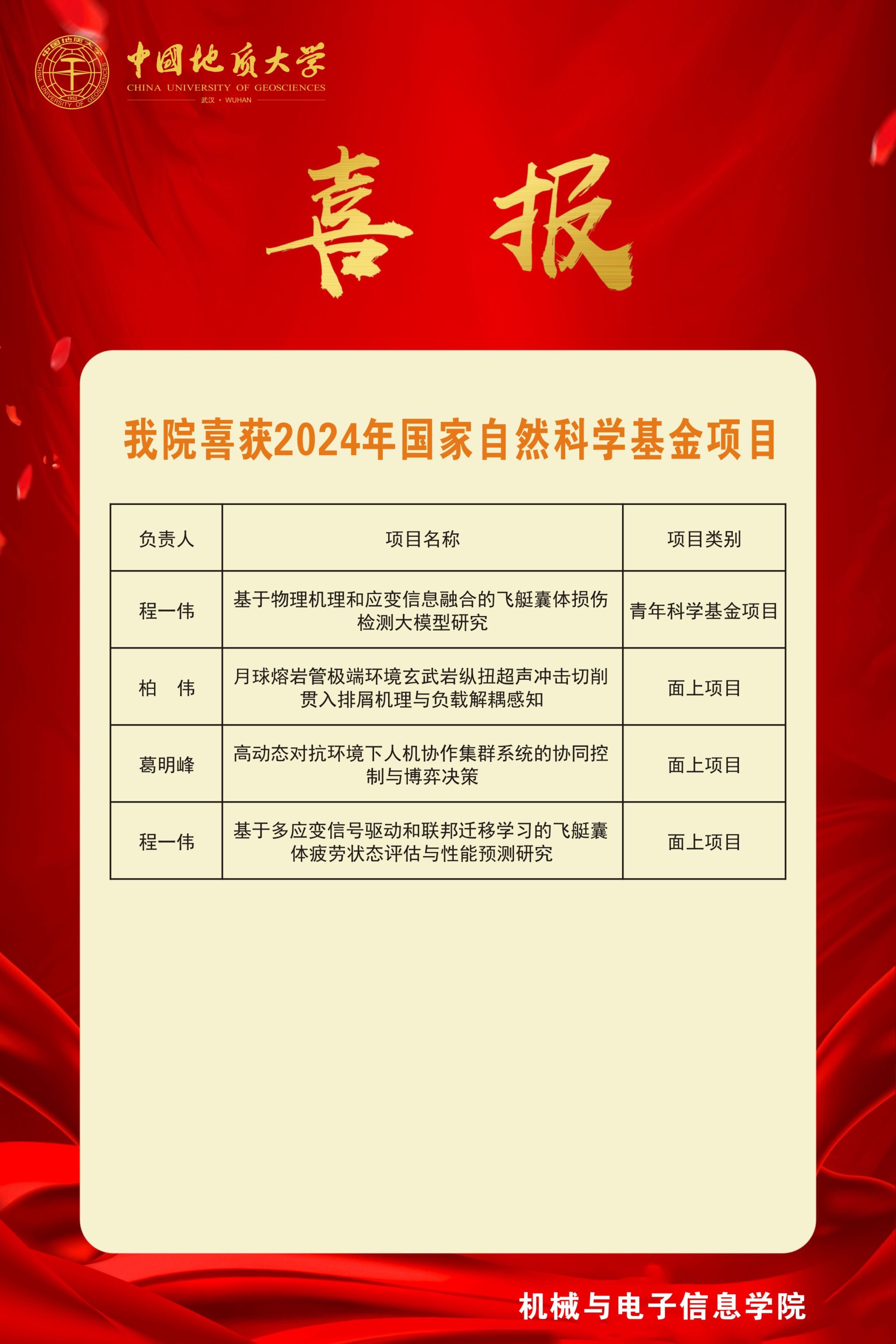 喜报-beat365官网2024年获得4项国家自然科学基金