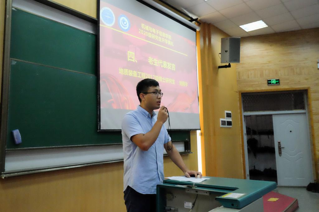 老生代表、地质装备工程2017级博士生研究生姚翔宇发言。他结合自己研究生学习生活的经验,畅谈科研之路的钻研与坚持,希望同学们能够迸发雄心、铸就耐心、不忘初心和保有爱心。