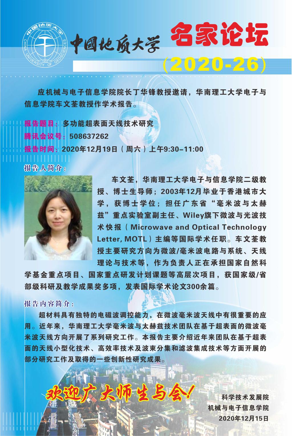 【12月9日】名家论坛:华南理工大学车文荃教授