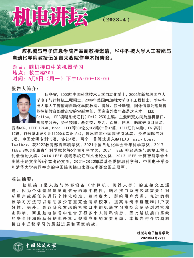 【6月5日】机电讲坛(2023-4:华中科技大学人工智能与自动化学院教授伍冬睿来beat365官网作学术报告会