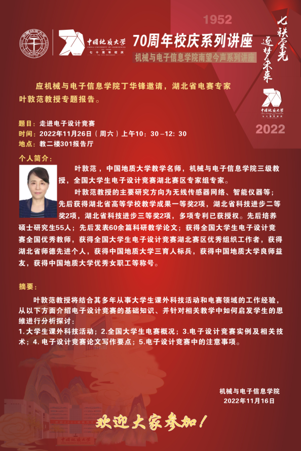 【11月26日】校庆系列学术活动---机电讲坛(2022-32):湖北省电赛专家叶敦范教授