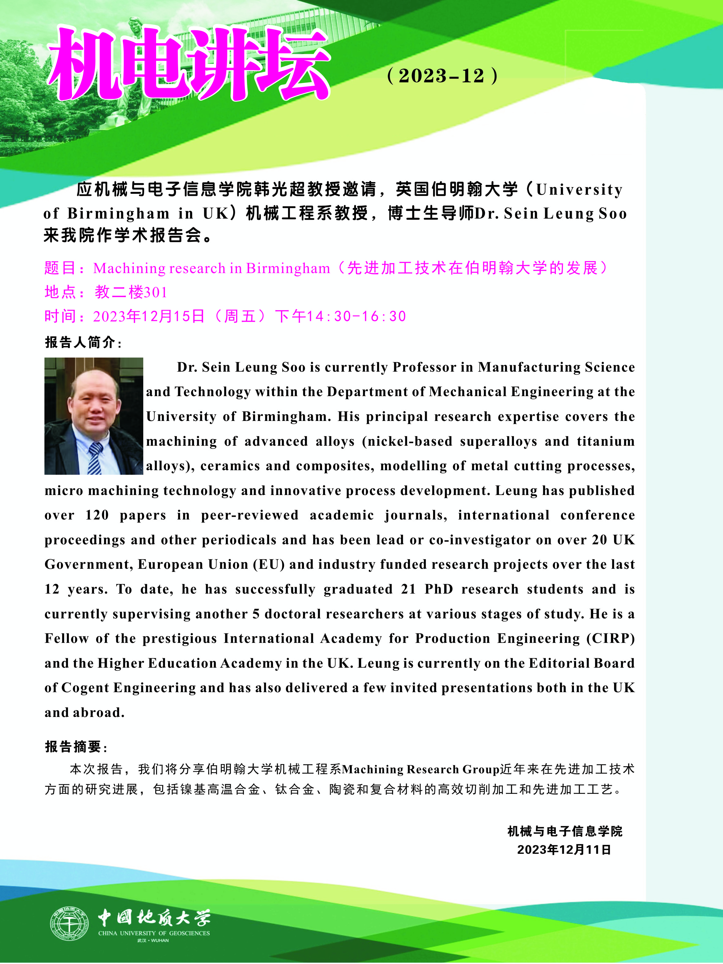 【12月15日】机电讲坛(2023-12):英国伯明翰大学Dr. Sein Leung Soo来beat365官网作学术报告会