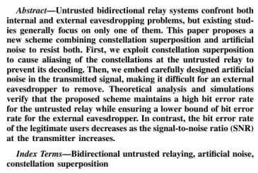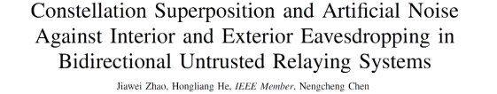 近日,beat365平台官方网站通信系2022级本科生赵家伟以第一作者在IEEE国际知名期刊IEEE Wireless Communications Letters发表题为“Constellation Superposition and Artificial Noise Against Interior and Exterior Eavesdropping in Bidirectional Untrusted Relaying Systems”的学术论文。该论文提出了基于人工噪声的星座叠加技术,为双向中继系统对抗来自内部和外部的非法窃听提供了创新性解决方案。论文的指导教师为通信系特任副教授贺宏亮。
